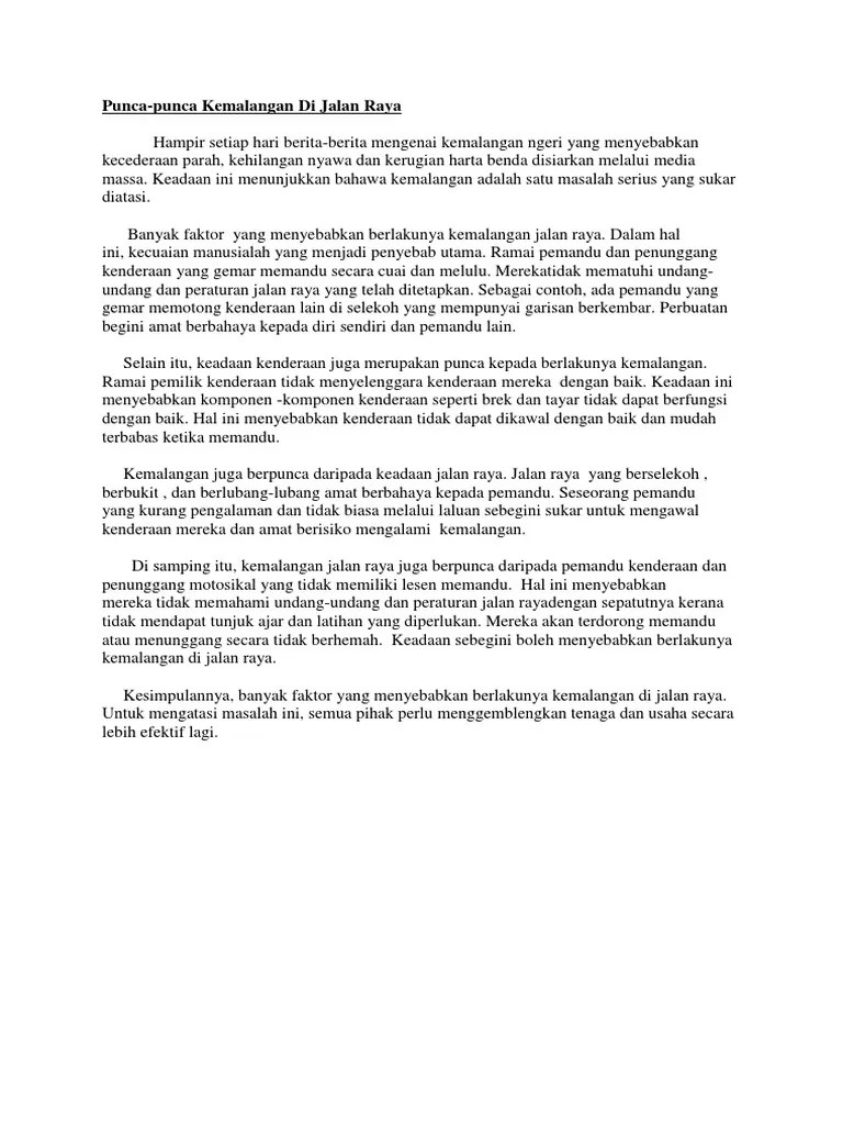 Karangan Faktor Kemalangan Jalan Raya - Karangan Ppsr Punca Punca Kemalangan Di Jalan Raya Duniaku Nasa2k. Apakah punca berlakunya kemalangan jalan raya dan langkah untuk mengatasinya. Faktor utama yang menyebabkan berlakunya kemalangan jalan raya ialah sikap pengguna jalan raya itu sendiri.